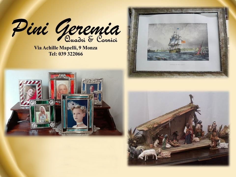 La “Ditta Pini Geremia” si occupa di confezione e montaggio di cornici, dispone inoltre di un elegante negozio di oggettistica e stampe nel CENTRO STORICO di MONZA.